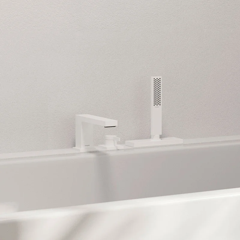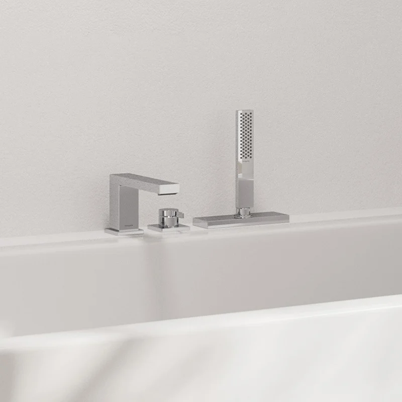 - В комплект входят: трехрычажный смеситель для ванны с креплением на бортике, ручной душ, душевой шланг, держатель для душа.