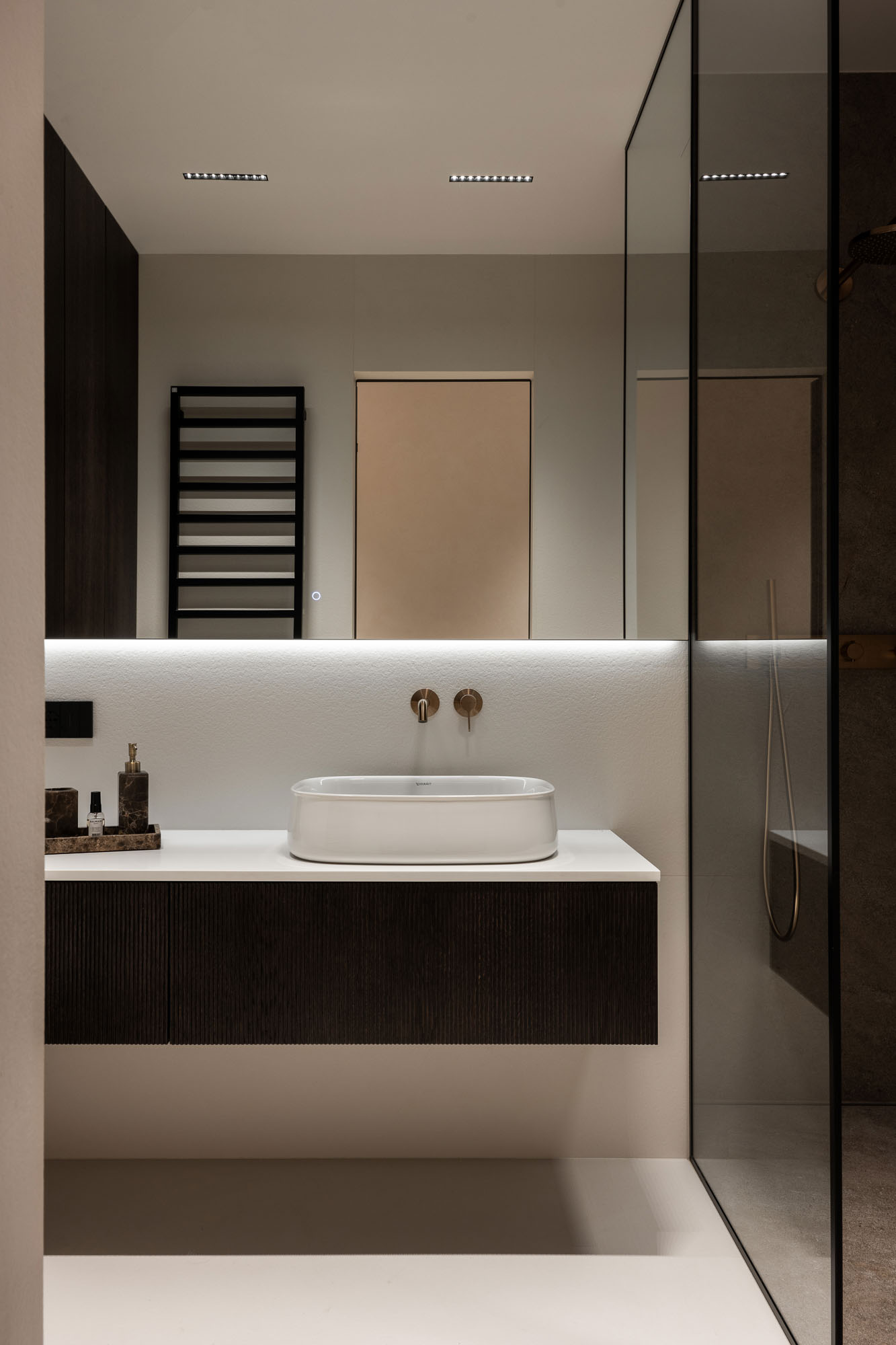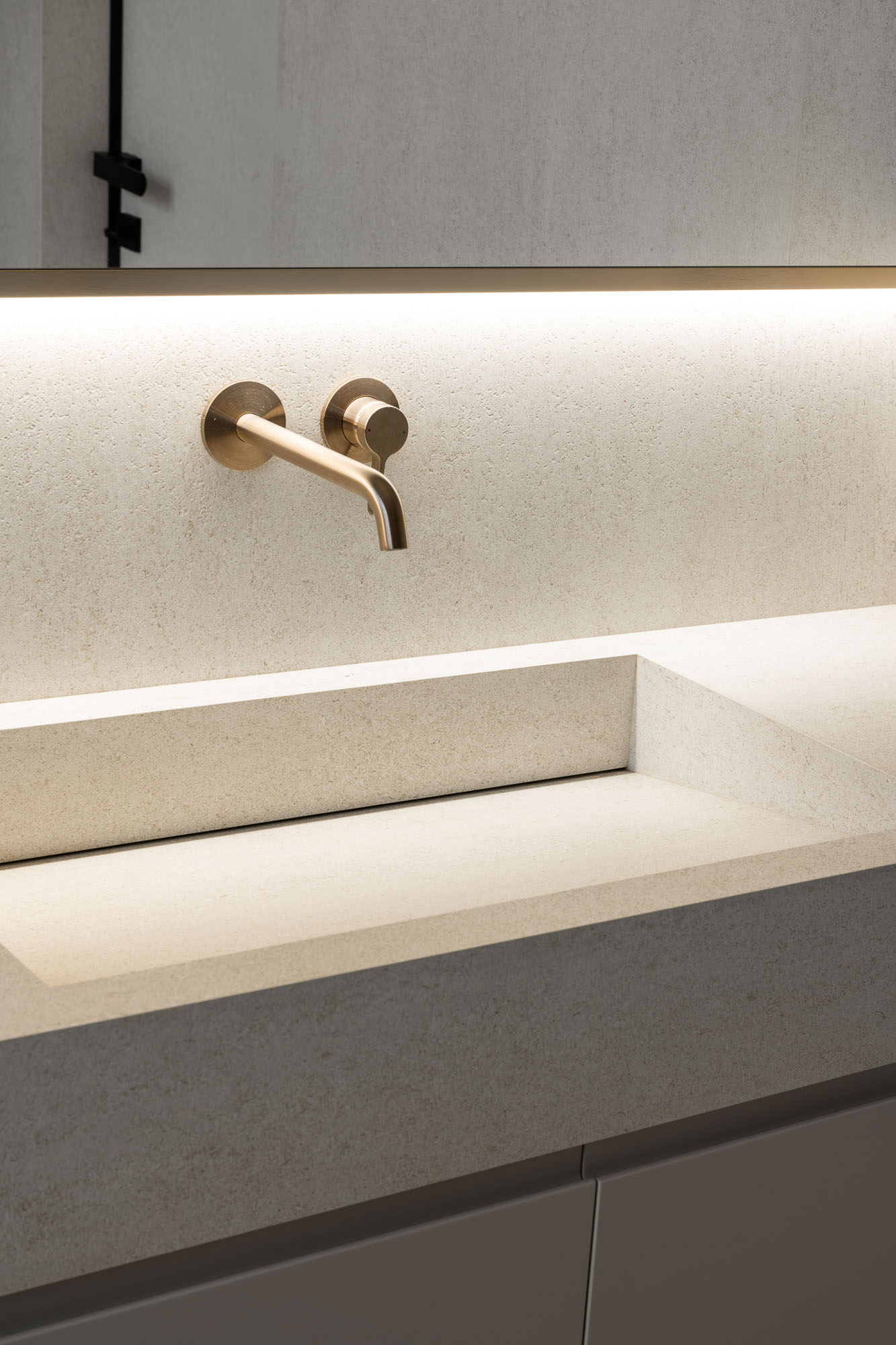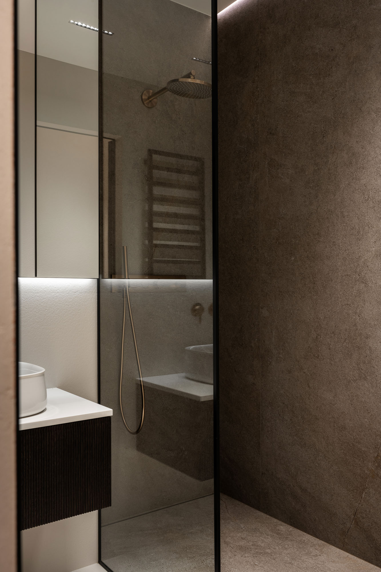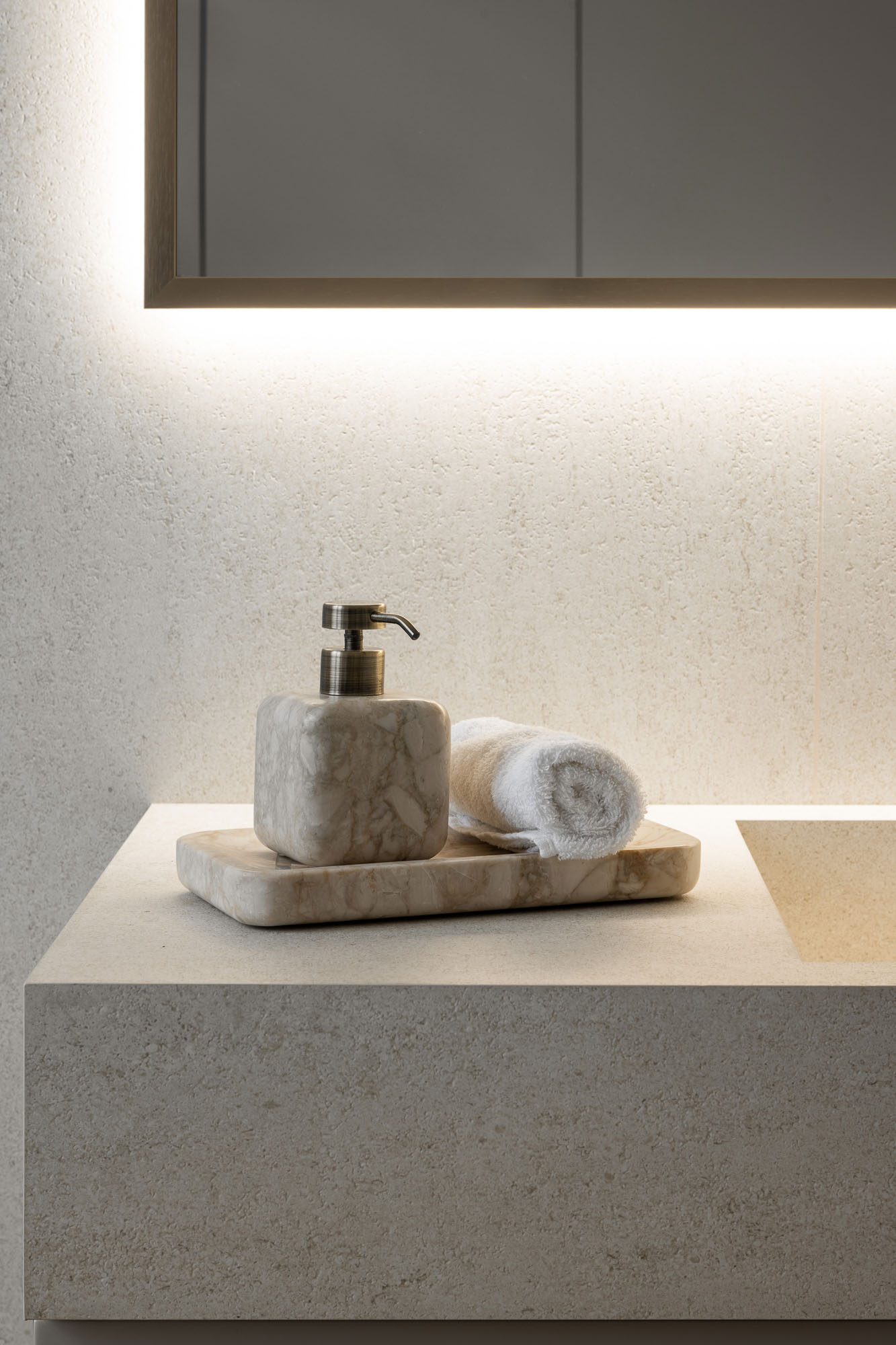 В ванных комнатах использованы поверхности INALCO MDi — Atalaia, Jasper и Silk Blanco,