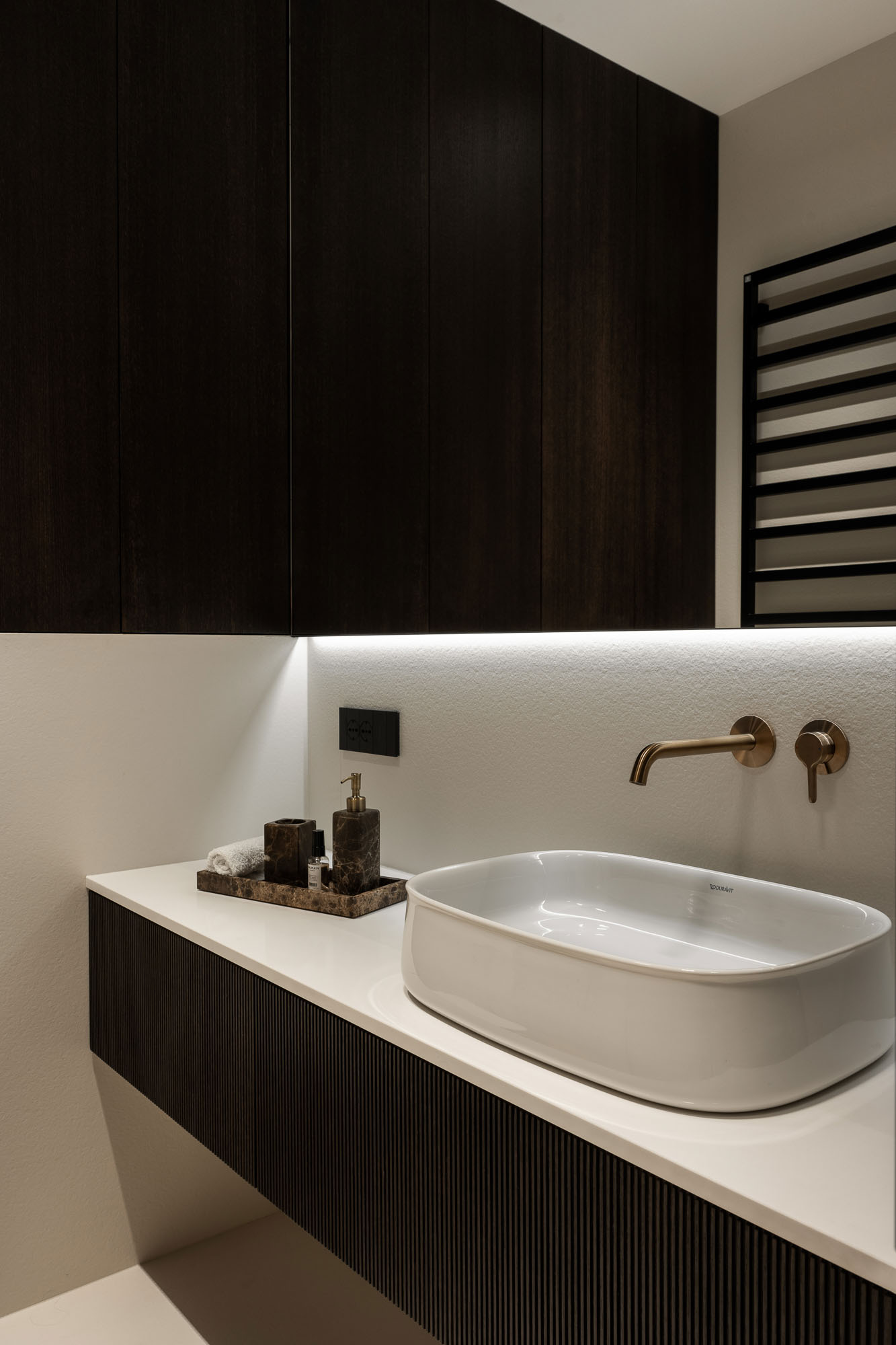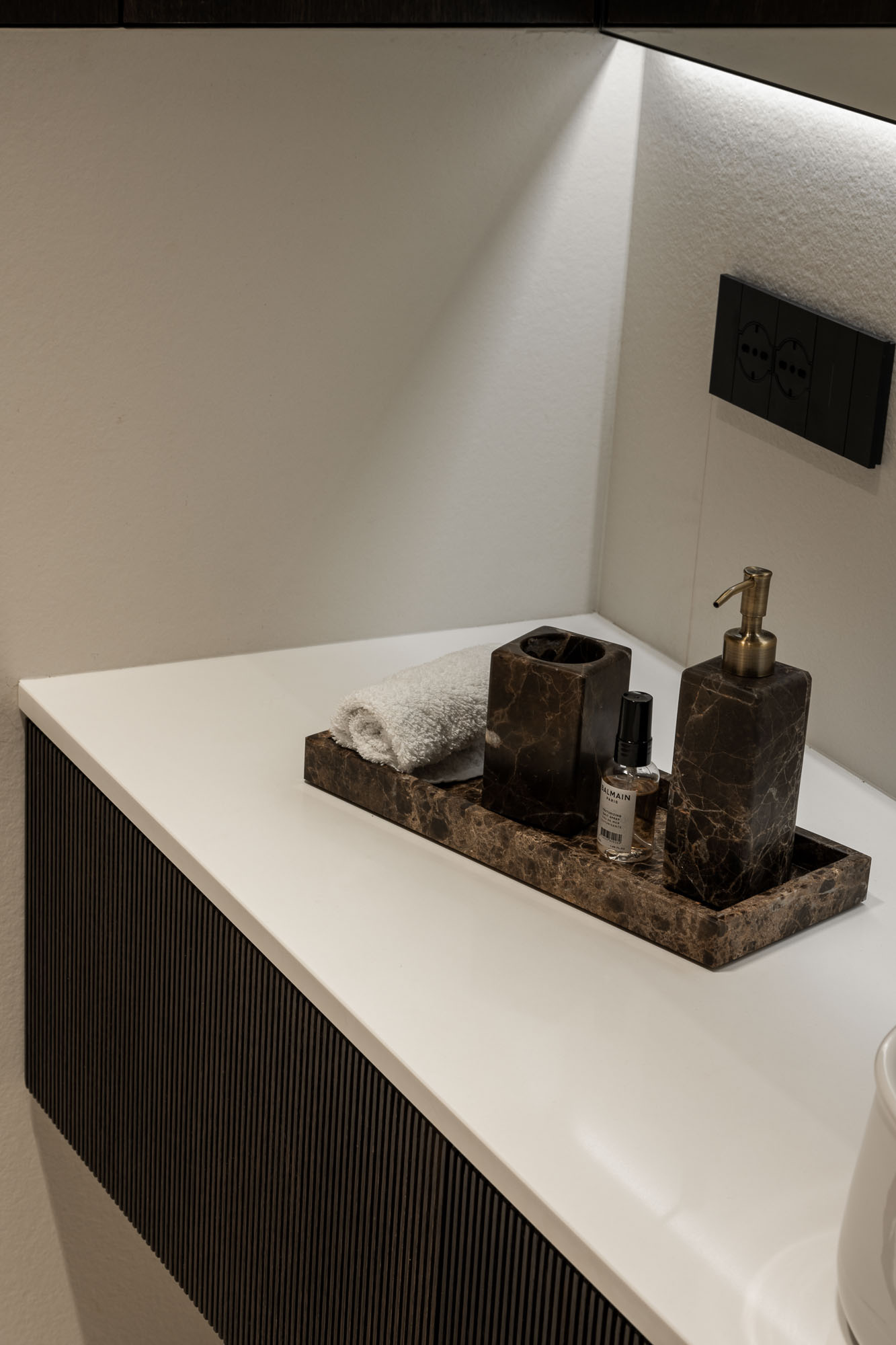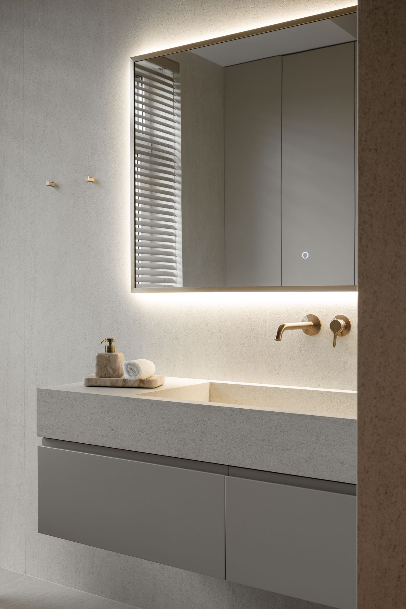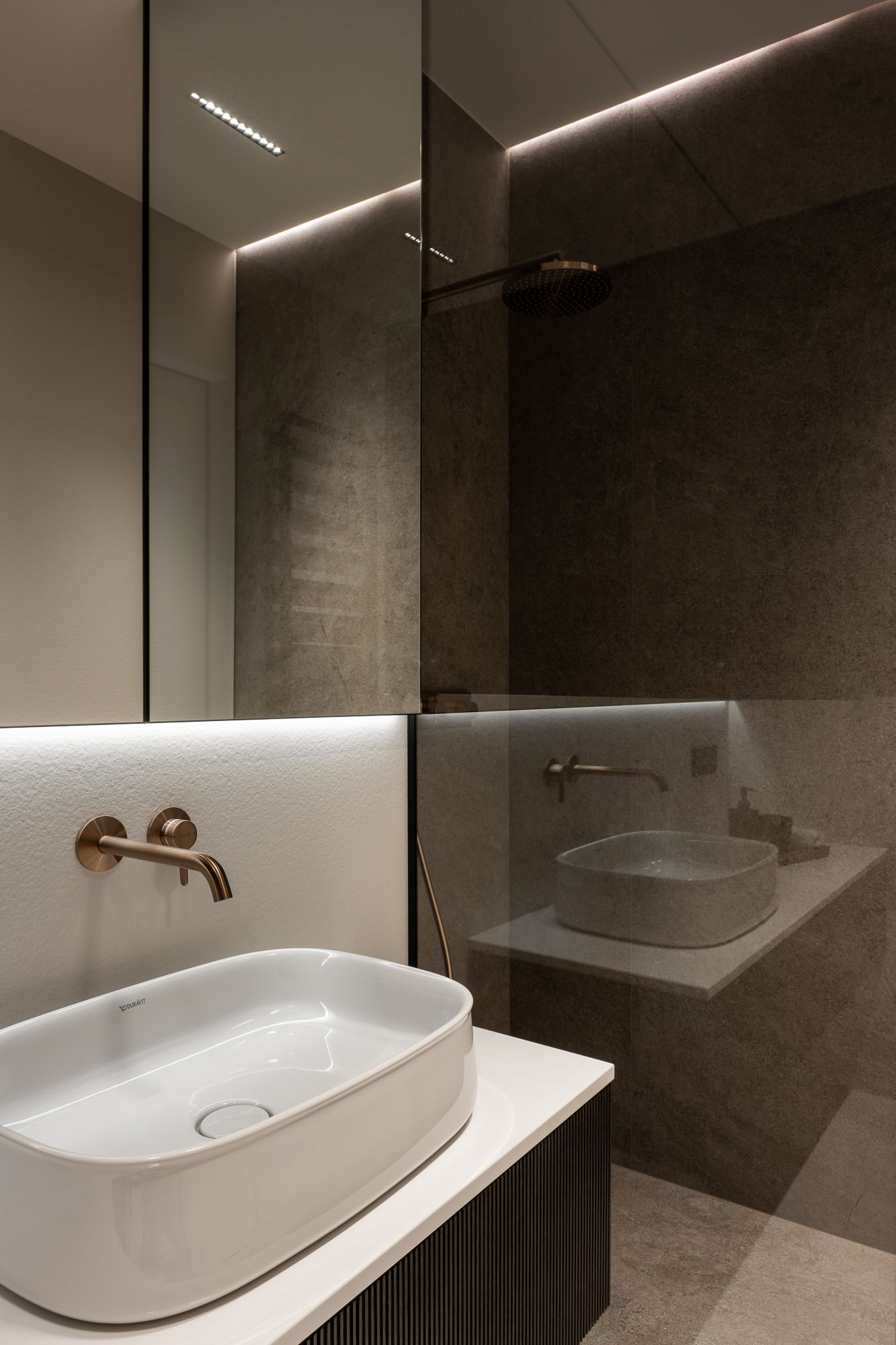В ванных комнатах использованы поверхности INALCO MDi — Atalaia, Jasper и Silk Blanco,